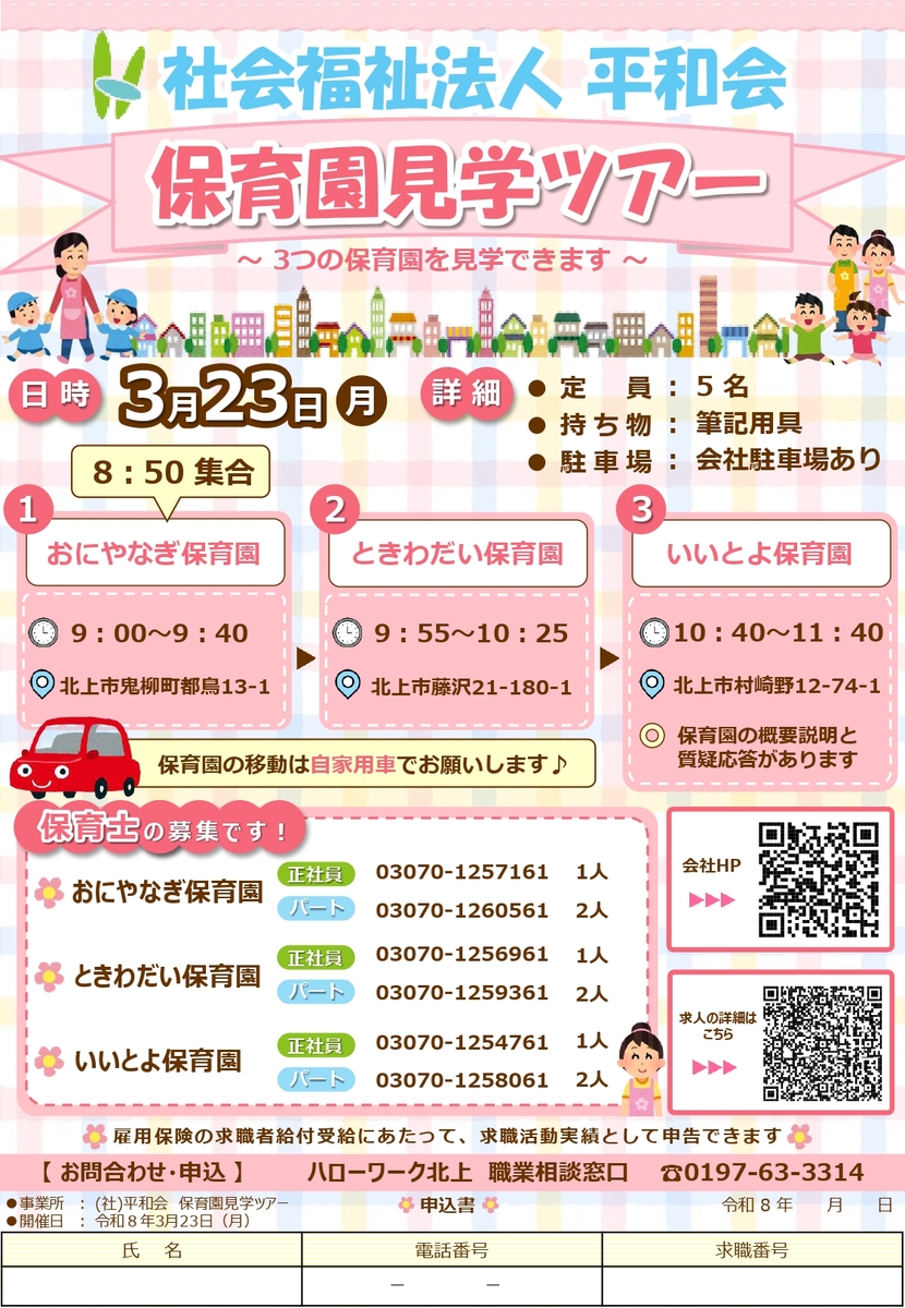 3/23(月) 保育園見学ツアー (ハローワーク北上主催)
